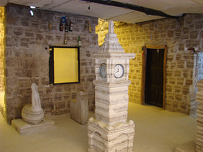 Vzhledem k neuvěřitelnému množství soli asi nikoho nepřekvapí, že tento hotel Playa Blanca, který jsme navštívili uprostřed rozlehlého salaru, je postaven výhradně ze solných kvádrů. Ze soli jsou i hodiny na snímku (samozřejmě kromě ciferníku :-)