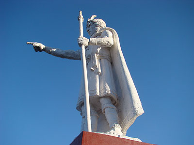 Po příjezdu do Puna jsme měli dostatek času na prohlídku města. Dokud ještě svítilo Slunce, vystoupali jsme na malé návrší Huajsapata, kde stojí socha prvního Inky Manco Capaca, jež ukazuje na místo svého zrození - na jezero Titicaca.