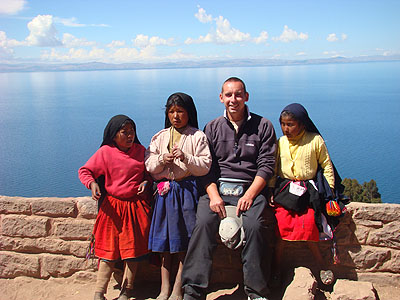 Jestliže mě Los Uros mile překvapily, pak ostrov Taquile byl celkem zklamáním. Vyjímkou snad byl pouze výtečný oběd u domorodé rodinky (16Sol). A když jsem se chtěl vyfotit s jezerem v zádech, seběhly se ke mě tyhle děti, takže mě ta fotka nakonec stála i nějaké ty drobáky :-)